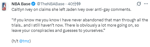 北京时间4月3日,前公牛球员杰登-艾维因发表争议言论被球队裁掉后,声称妻子凯特琳自此便不再与他联系。如今,凯特琳终于打破沉默,公开驳斥丈夫的说法,称这是一个谎言。
