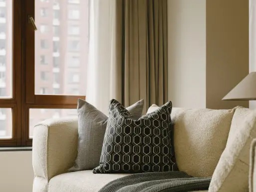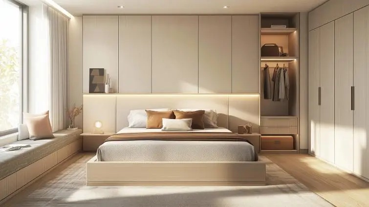 ②窗帘别直接挂明装罗马杆,做个隐藏式窗帘盒,再在里面嵌入一条灯带,晚上开灯的瞬间,温柔的光晕洒下来,氛围感直接拉满。